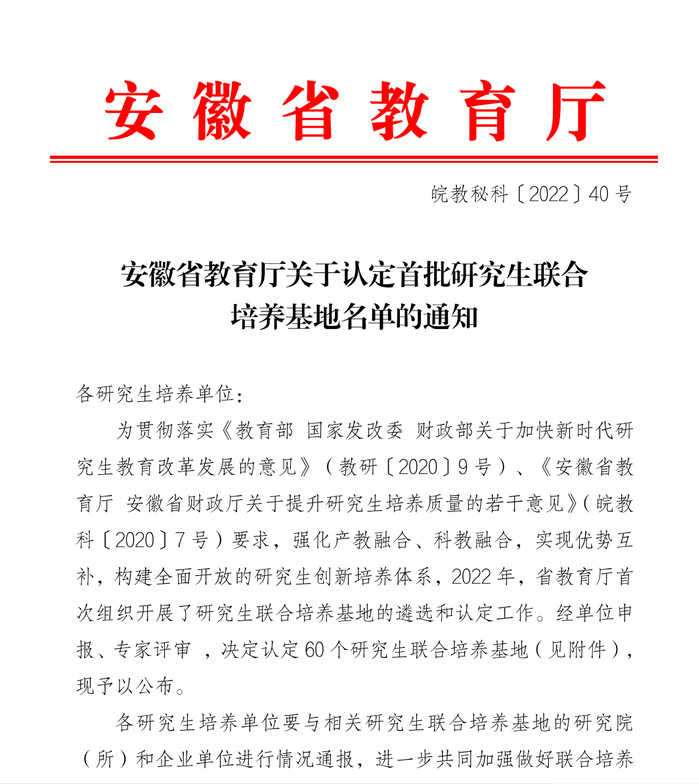 近日,安徽省教育厅组织开展了省级研究生联合培养基地的遴选和认定工作,经单位申报、专家评审,最终遴选出60个首批省级研究生联合培养基地(皖教秘科〔2022〕40号)。suncitygroup太阳官网联合安徽省路港工程有限责任公司、安徽富煌钢构股份有限公司申报了省级研究生联合培养基地,均成功入选。